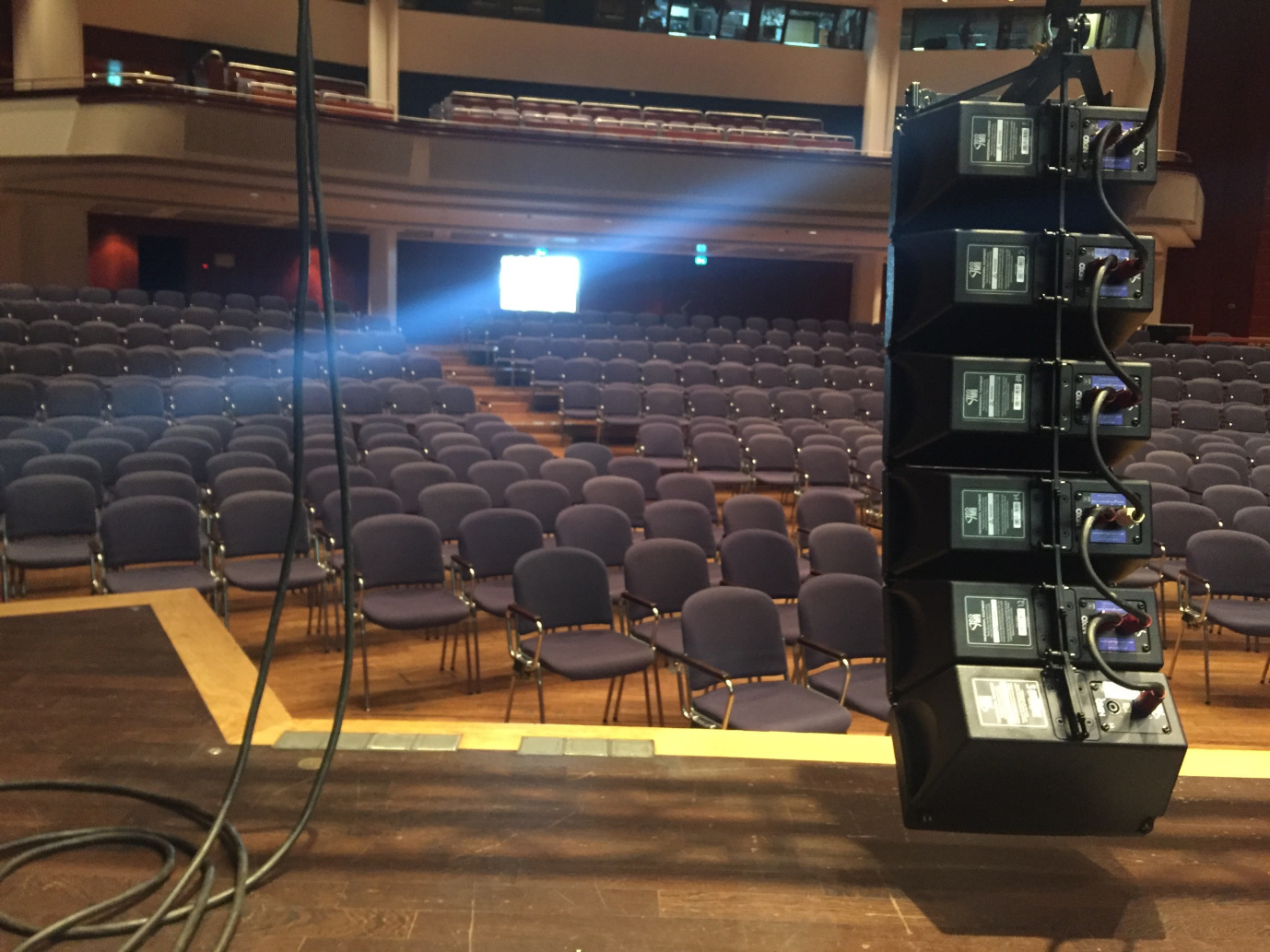 Az akusztikai tervezés során egy számítógépes programban megadjuk a terem méreteit és egyéb jellemzőit a hangfalak elhelyezkedését és ez megadja, hogy hogyan kell beállítani a hangfalakat a tökéletes hangzás érdekében, illetve megmutatja, hogy ezáltal milyen hang sugárzást tud nyújtani. A piros a jó érték, a kék a rossz, esetünkben ez a színpadi területet mutatja, ami egyébként is monitor hangfalakkal van ellátva és oda a PA hangfalak alapesetben nem szólnak.